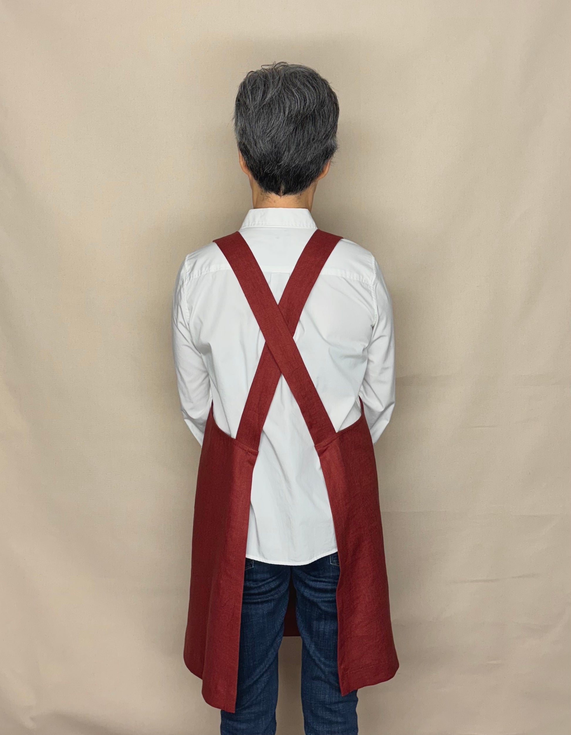 The 'Merlot Red Japanese Apron' is made of 100% linen material, please expect slight shrinking and mild wrinkling.