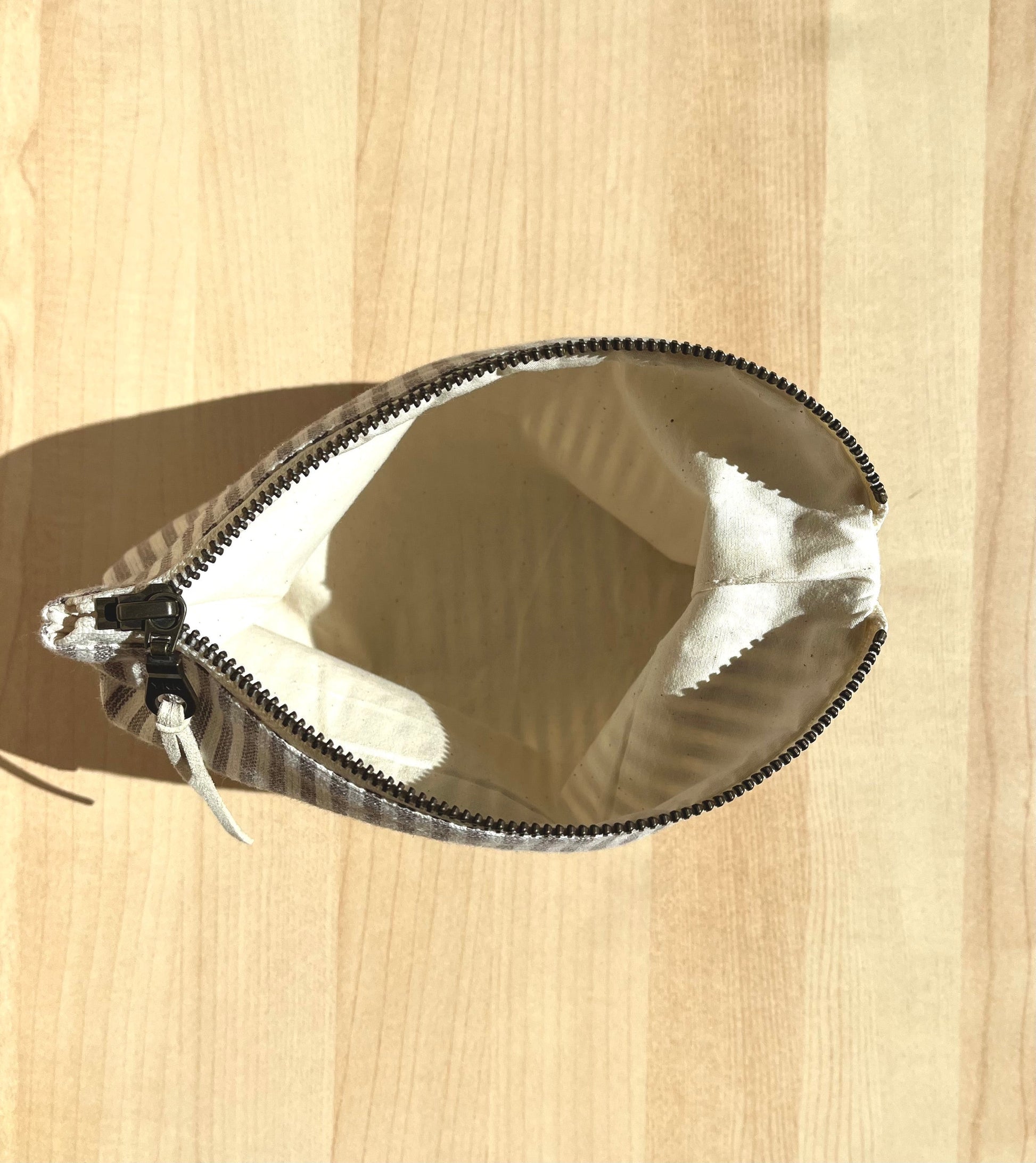 This pouch is made with two layers of fabric, a hemp-cotton exterior and 100% cotton interior, a YKK custom brass zipper and a vegan leather pull tab.
