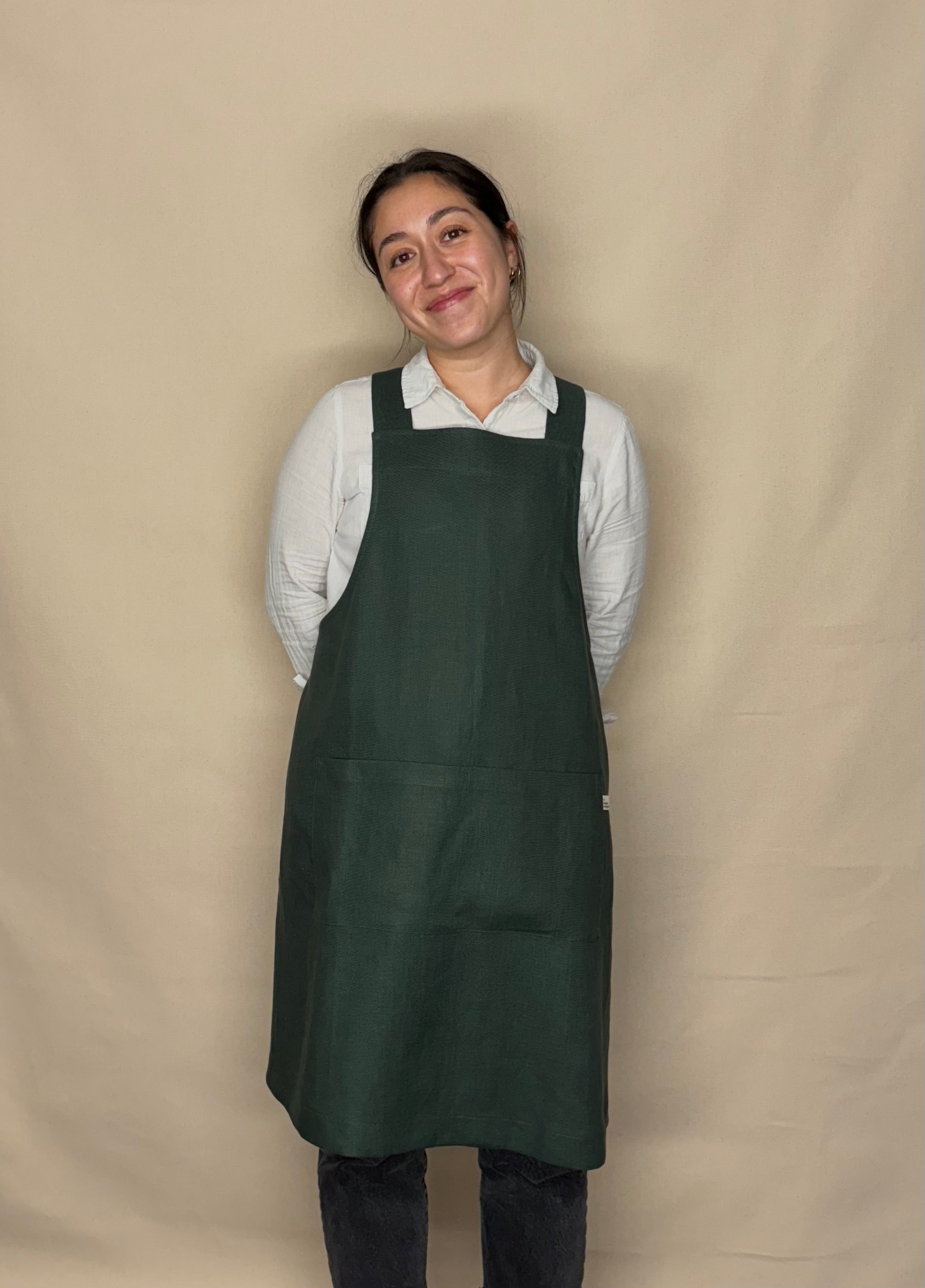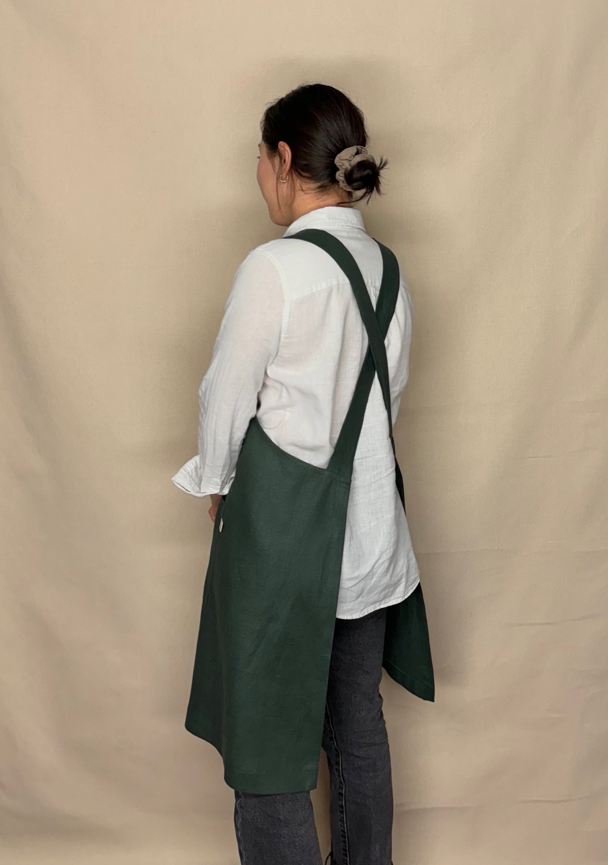 The 'Forest Green Japanese Apron' is made of 100% linen material, please expect slight shrinking and mild wrinkling.