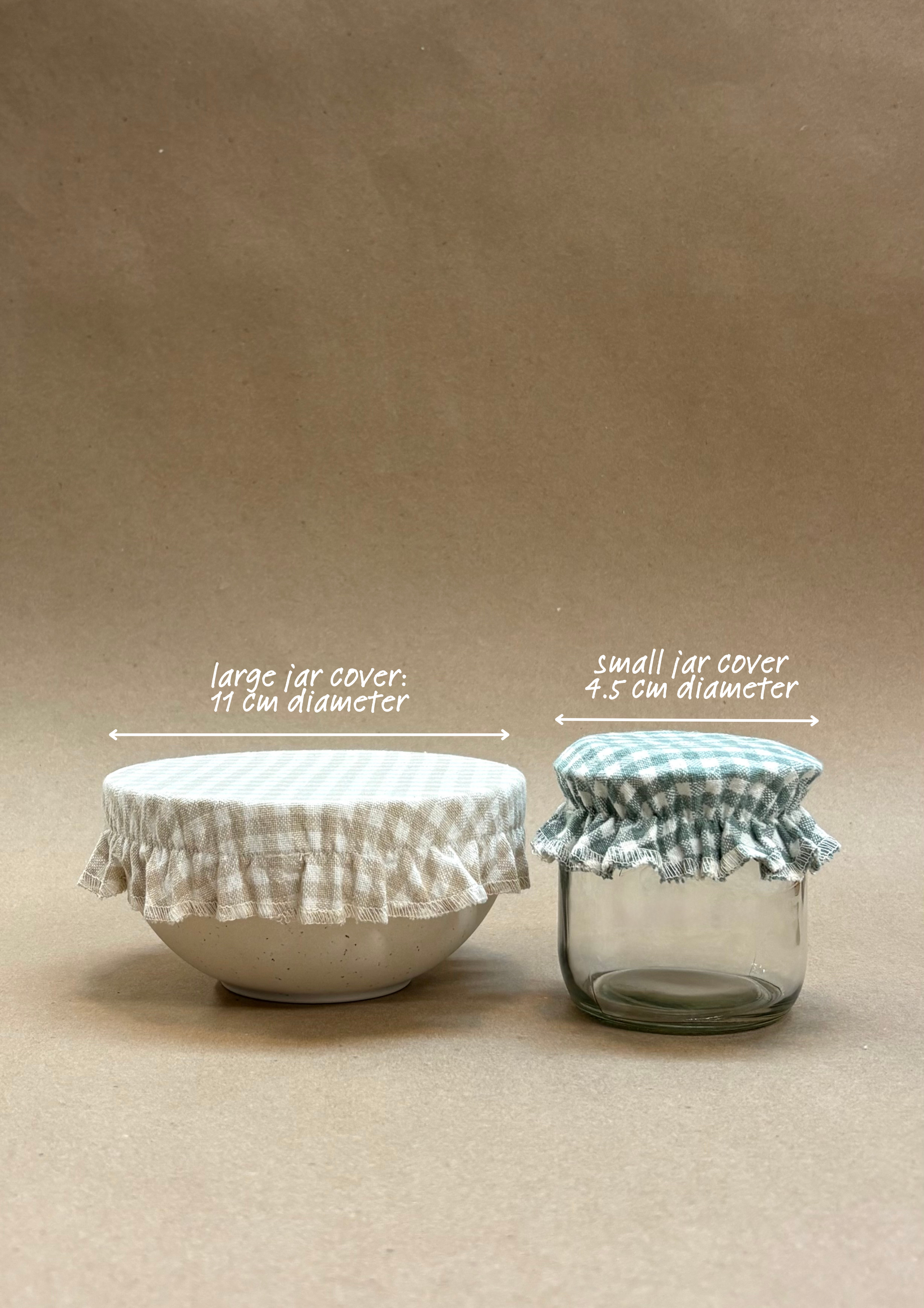 Our small jar covers are perfect for most sized mason jar openings 7.62 cm (3in) diameter, "sealed" with an elastic.
